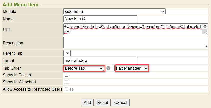 1. Click on the Tab Order drop downs to set where the New File Q option will be located on the sidemenu