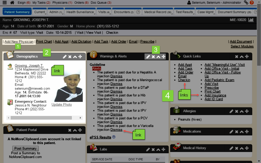 H. Encounter links: Links related to an open encounter, as well as a number of tabs and buttons, including: